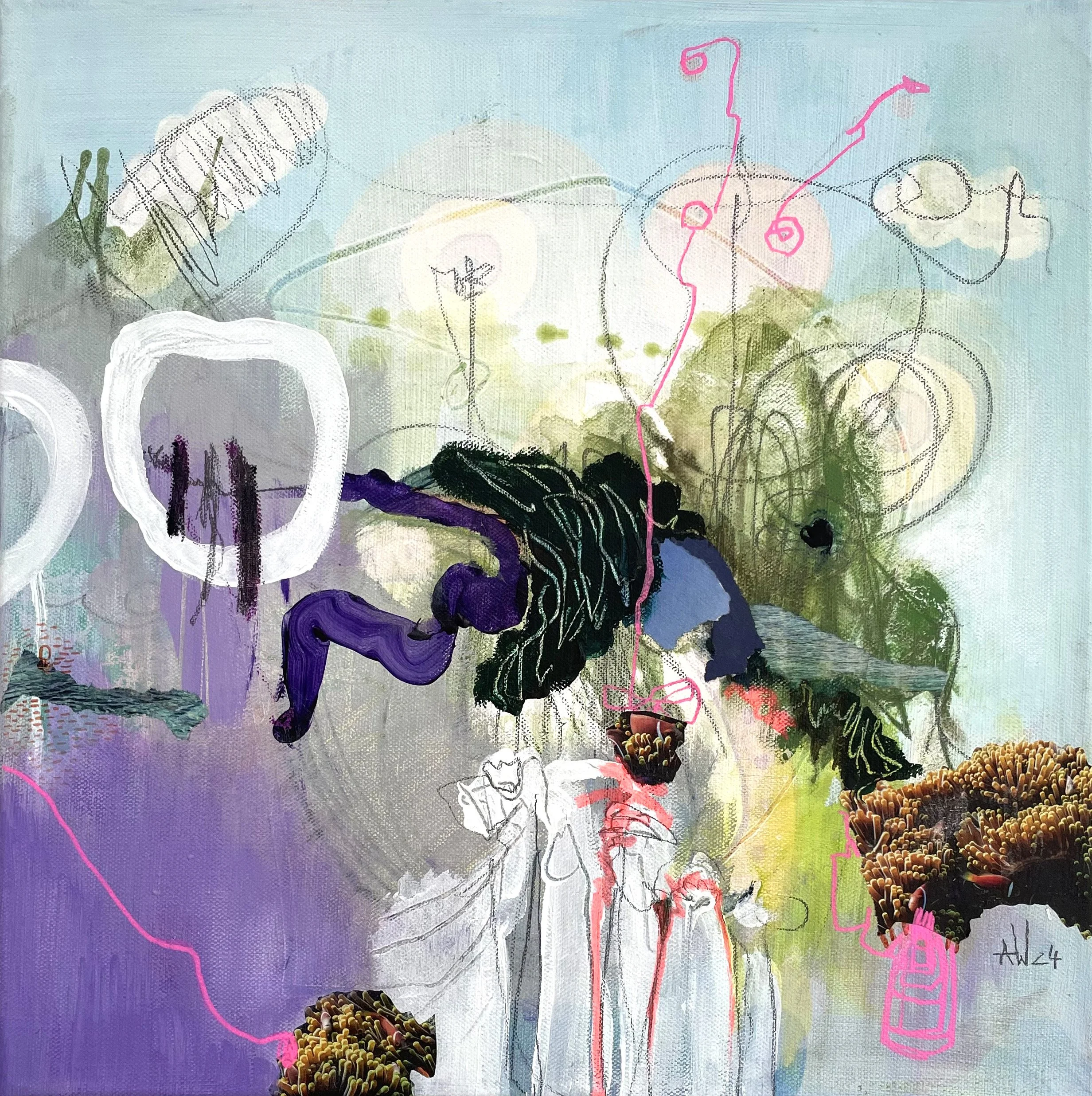 Die Verbindung collagierter, gezeichneter und gemalter Elemente steht als Sinnbild für den unendlichen Reichtum dieser Unter- und Überwasserwelten. Leuchtendes Wasser, Perlenketten, Blasen, Pflanzen und die Ideen der Fische, Anemonen und Weltraumwesen fließen hier in die Bilder mit ein.