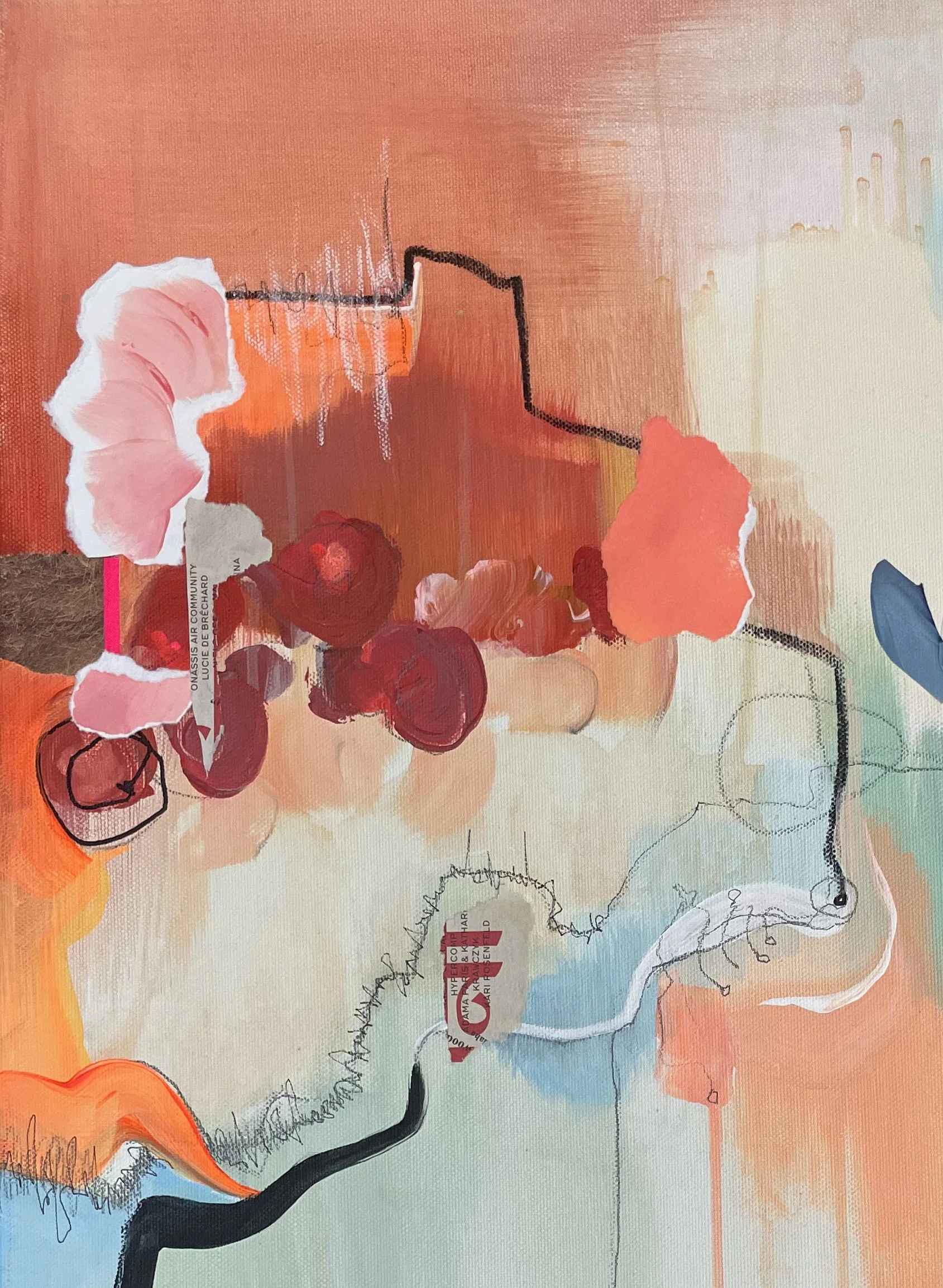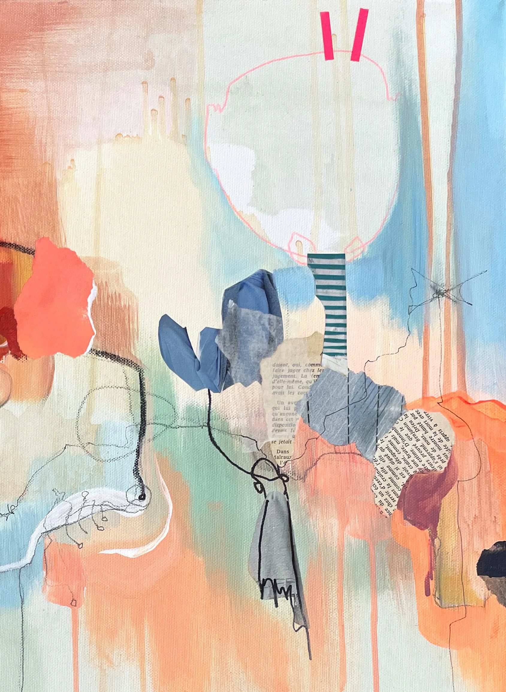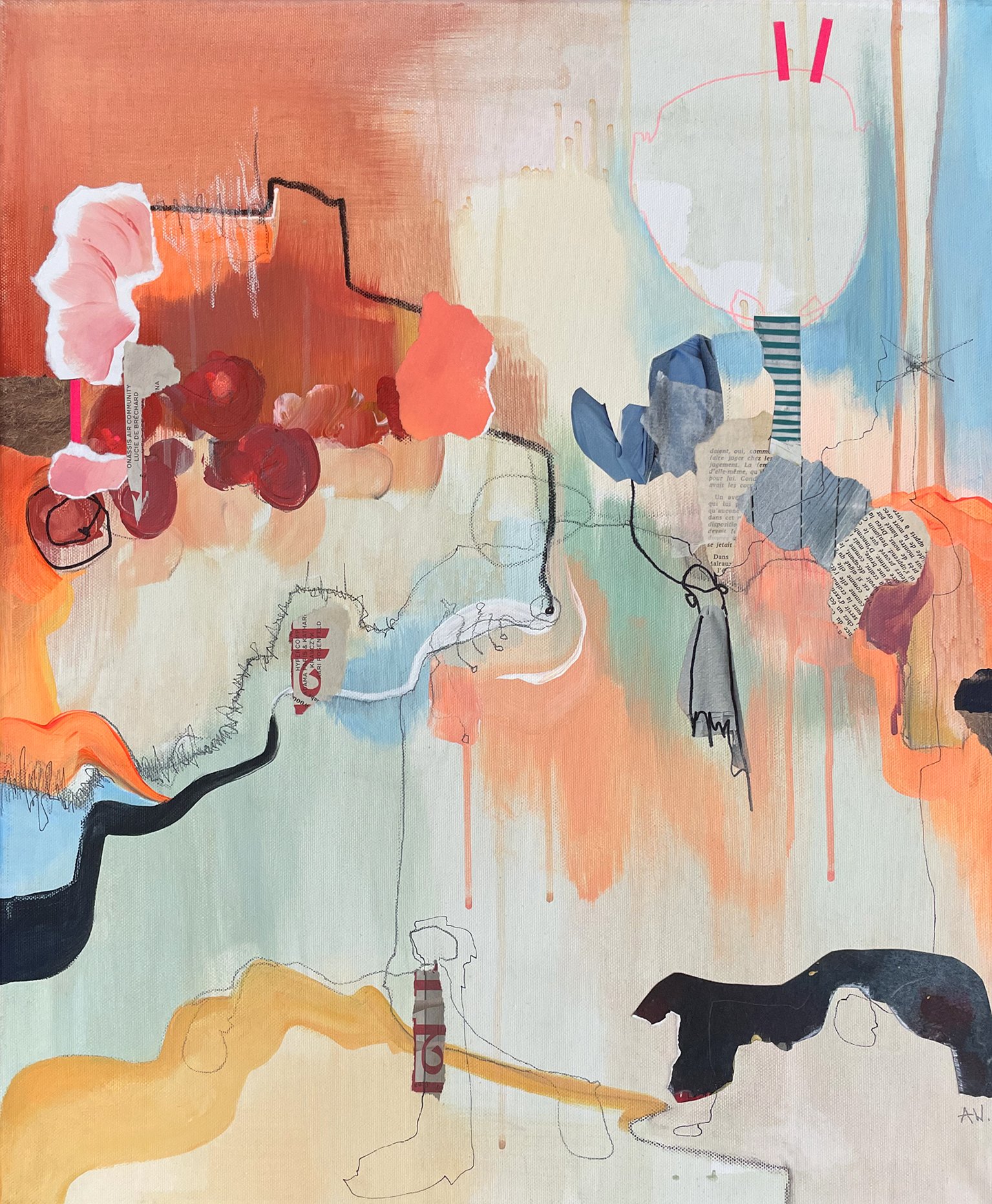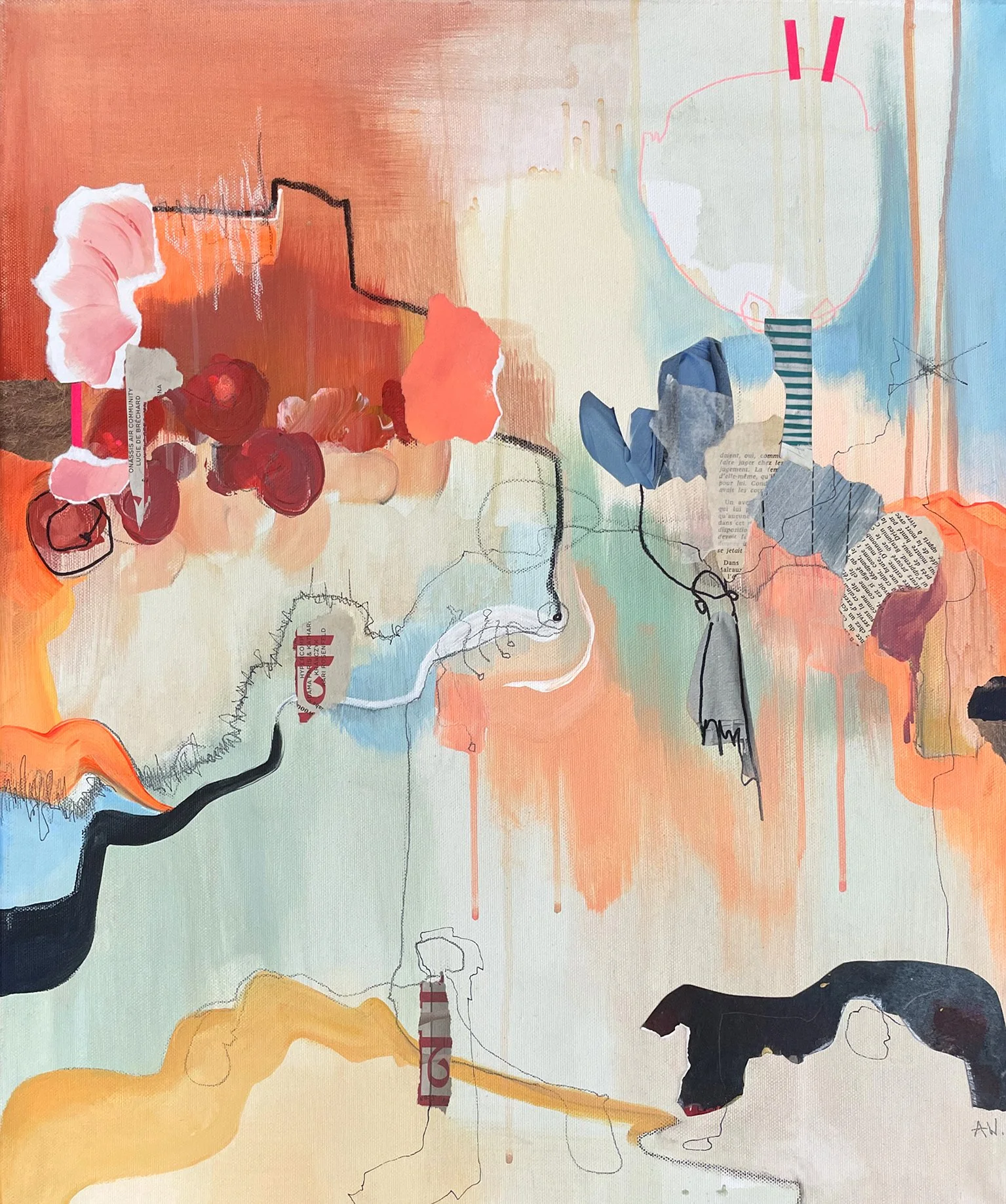 Acryl, Kreide, Papier und Marker auf Leinwand