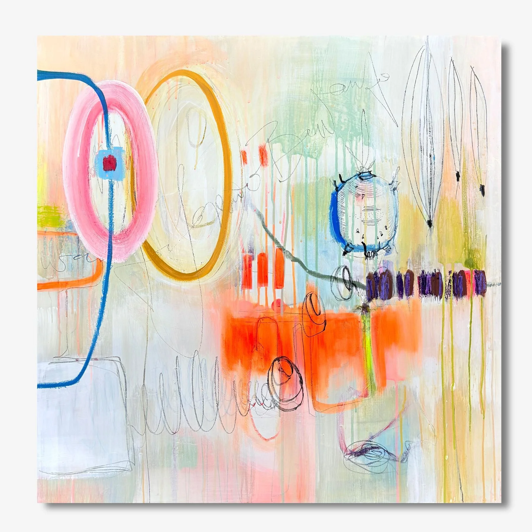Das Werk bewegt sich im Spannungsfeld zwischen Leichtigkeit und innerer Bewegung. Zarte Pastellflächen treffen auf kräftige Akzente. Transparente Farbschichten fließen ineinander, verlaufen nach unten und erzeugen ein Gefühl von Zeit, die nicht stillsteht.