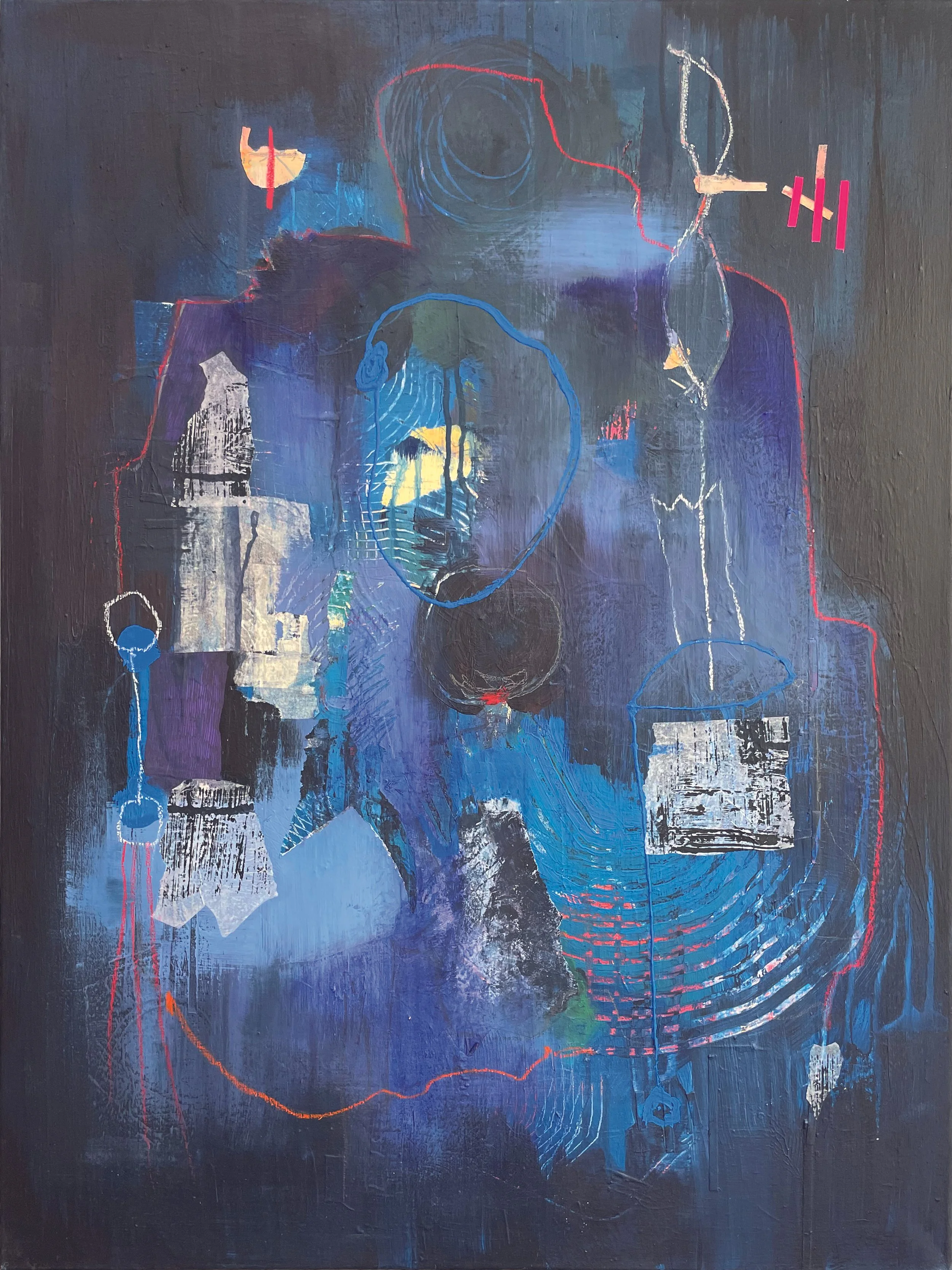 Nachtblaues Schwarz trifft auf leuchende, transparente Flächen und ungeordnete Linien und Spuren