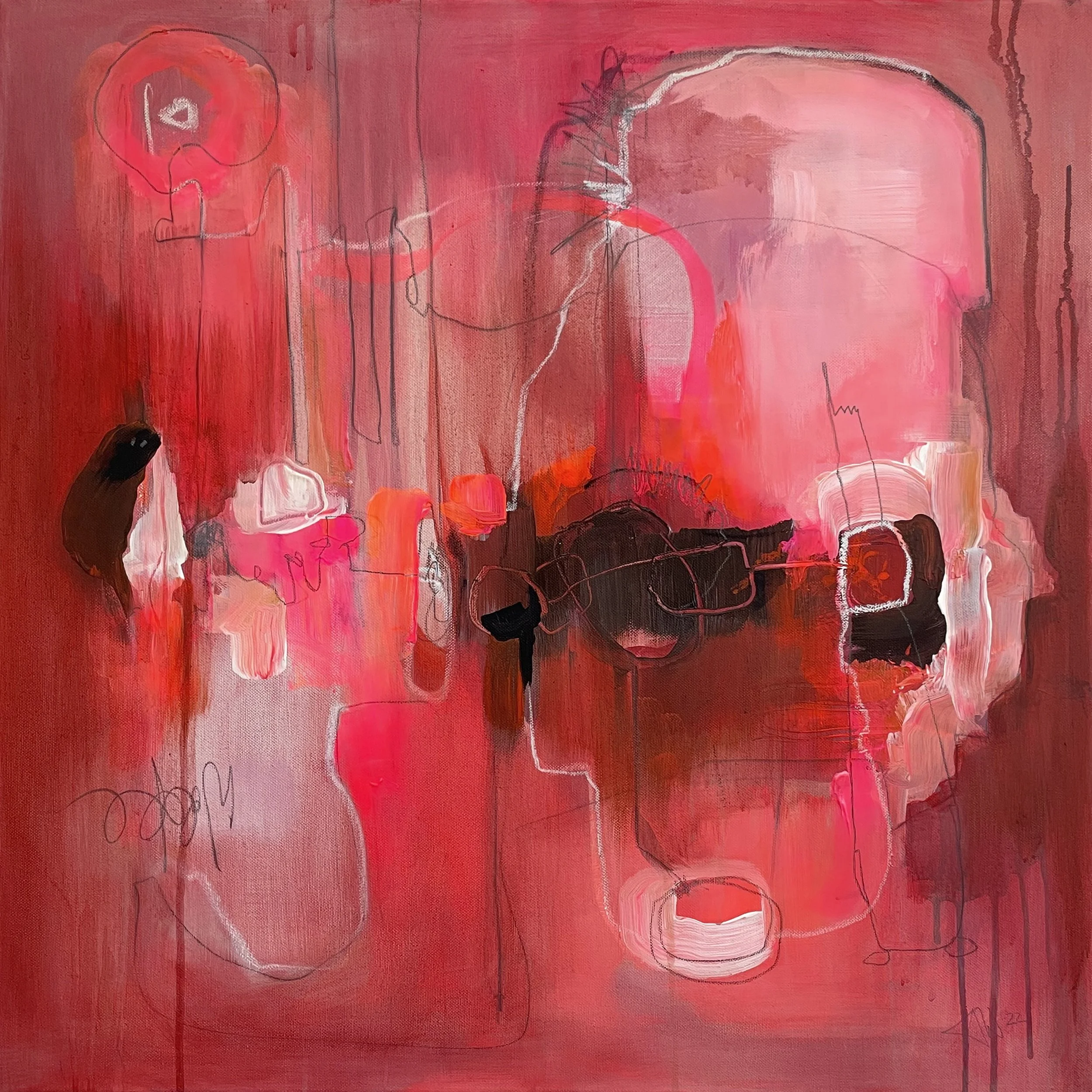 Organisch fließende, sich ausdehnende Formen verschmelzen mit vielschichtigen Rot- und Rosanuancen, die von tief und erdig bis leuchtend und transparent reichen.