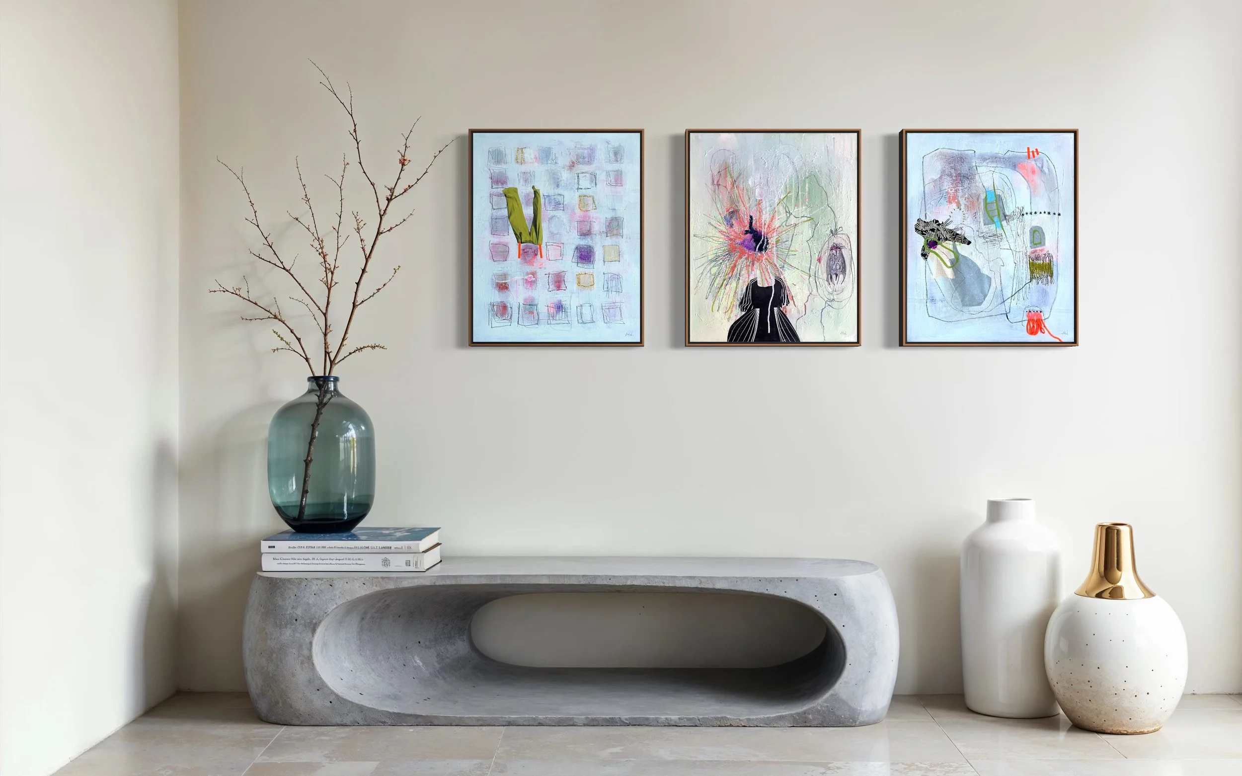 Die Serie entstand aus dem Impuls, innezuhalten in einem Moment des Zuviels. Aus dem Bedürfnis heraus, nicht alles gleichzeitig ordnen, entscheiden oder festhalten zu müssen. Statt Kontrolle ging es um Vertrauen in den Prozess – darum, dem Unsortierten Raum zu geben und darin eine neue Form von Freiheit zu entdecken.