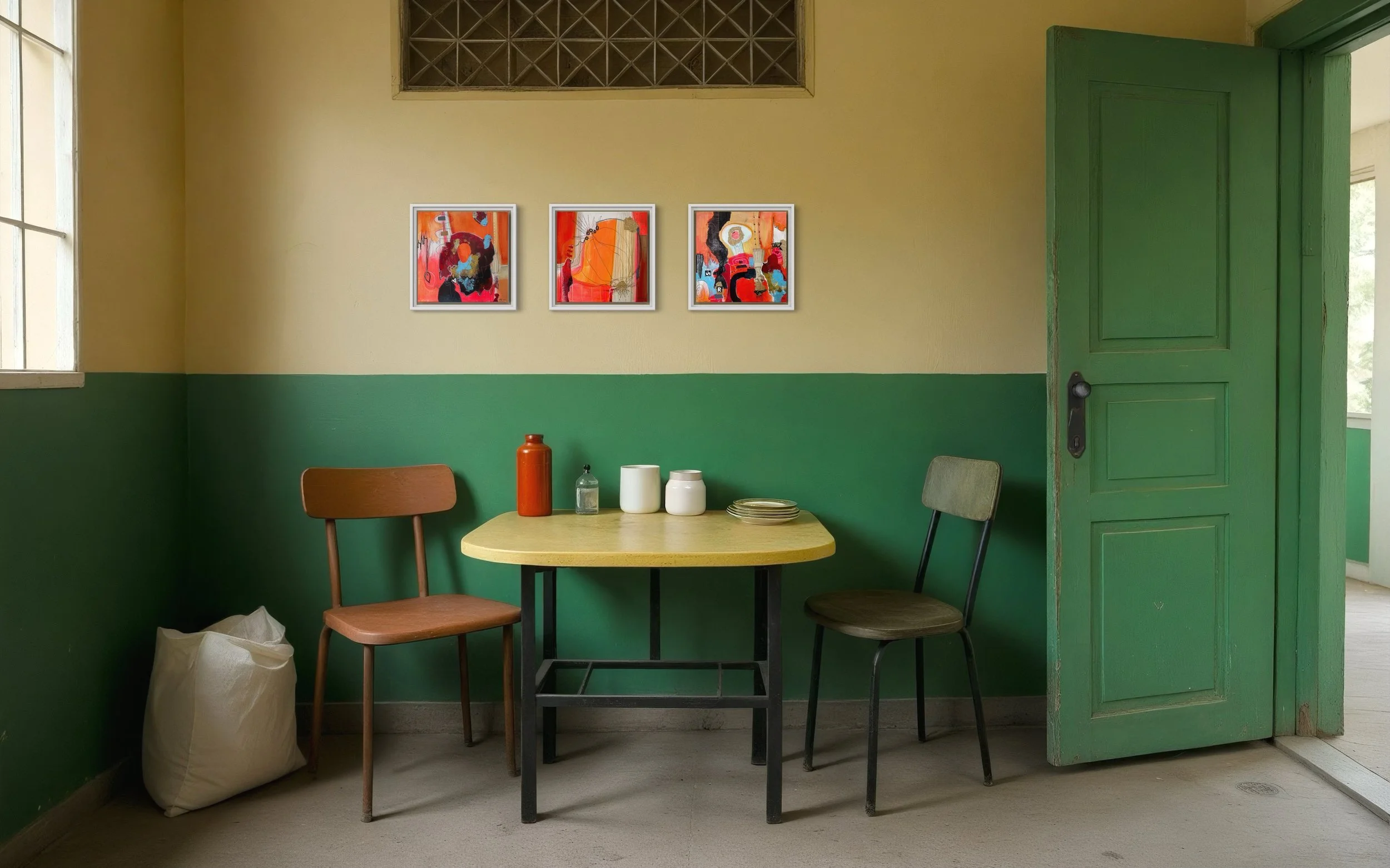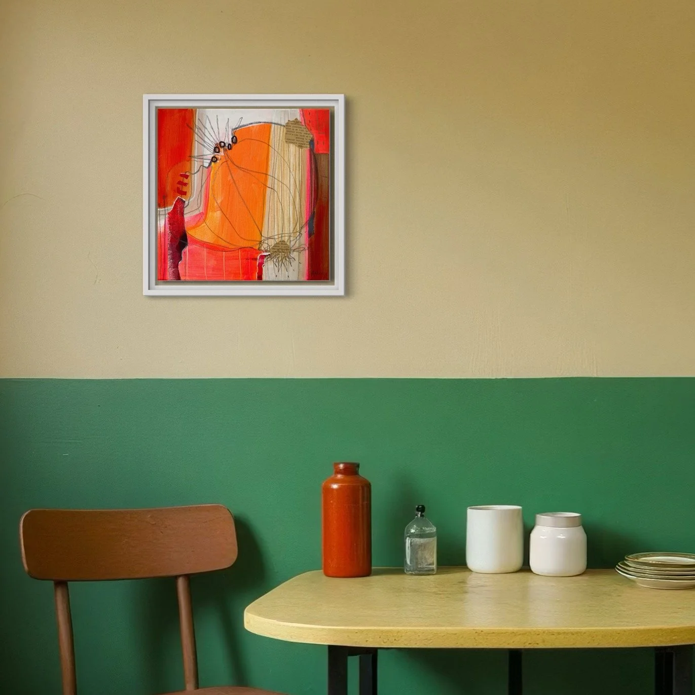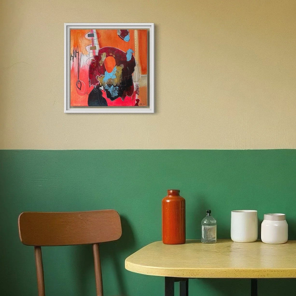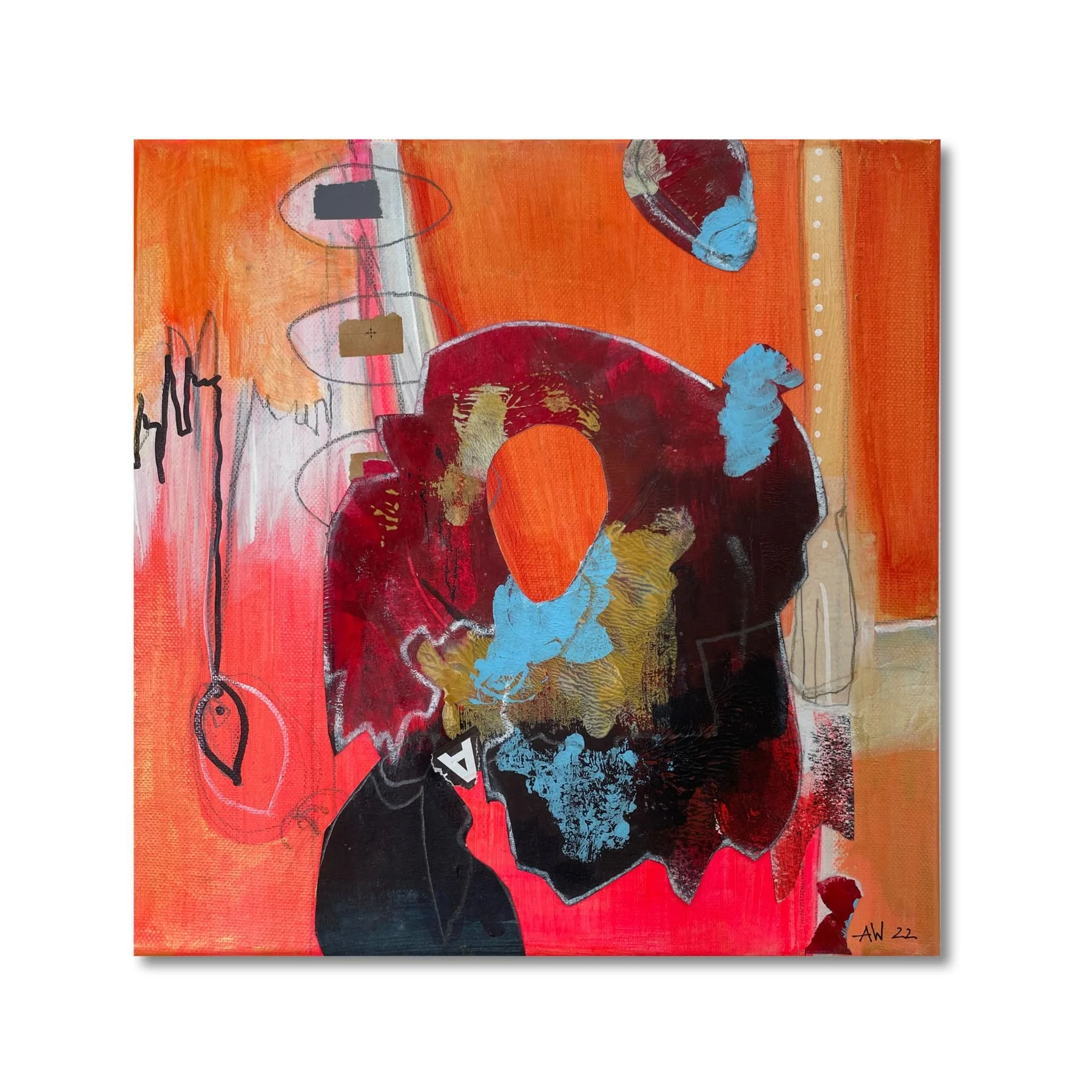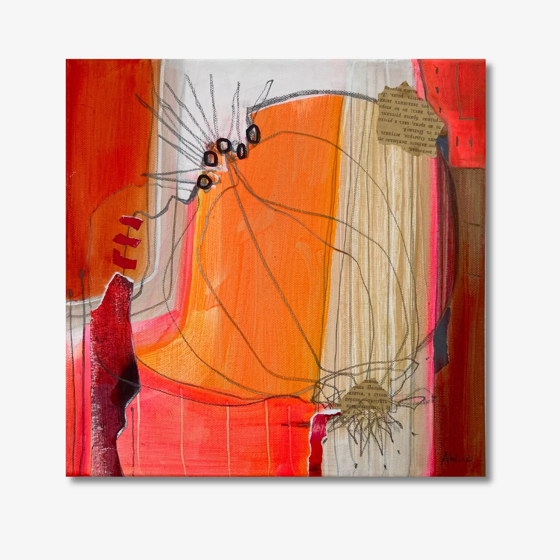Wie kann Frieden auf der Leinwand und in uns selbst herrschen, wenn kräftige Orangetöne sich gegenseitig befeuern und mit Farben, Formen und Strukturen spielen?