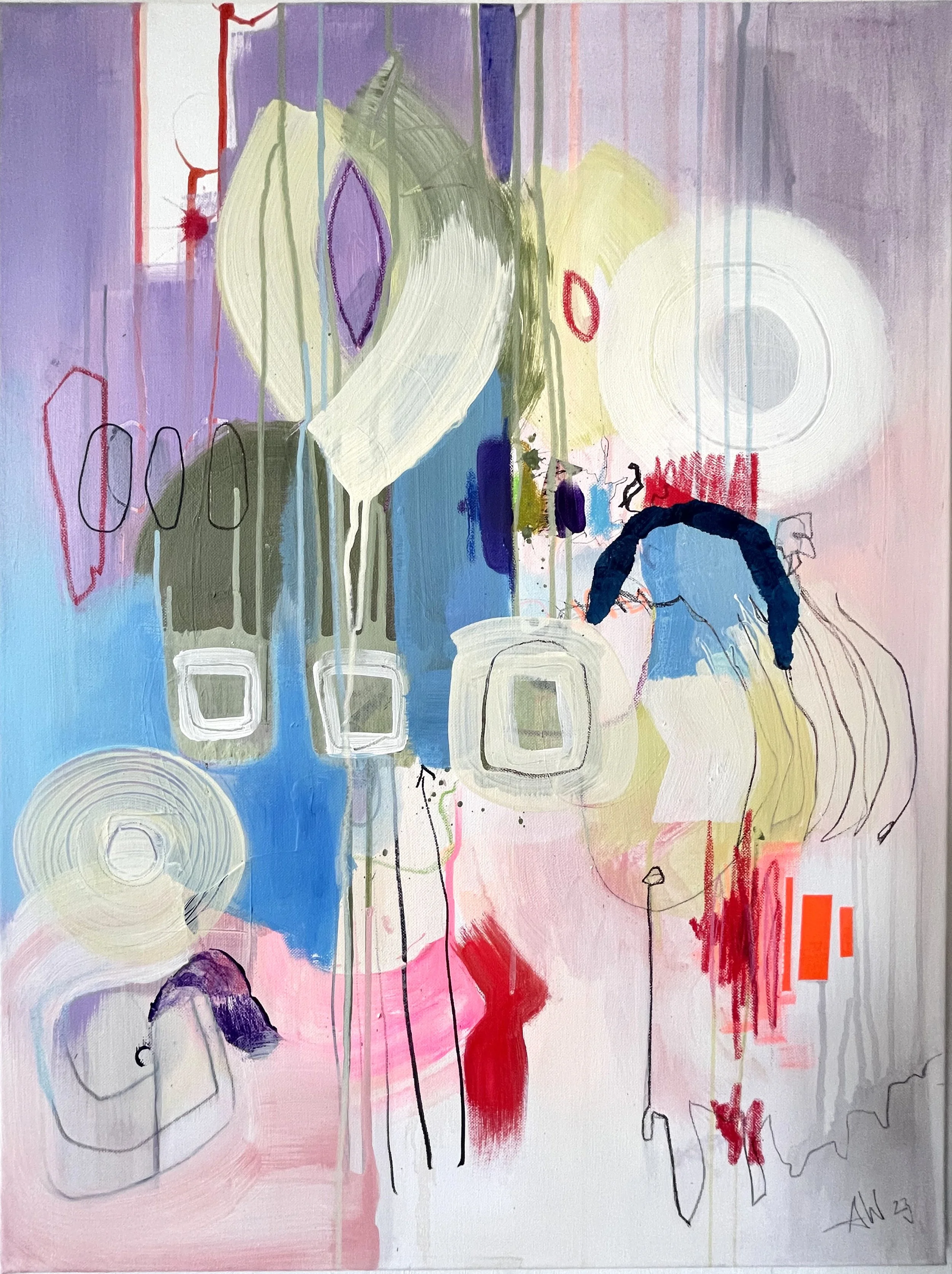 Der Mix aus Zeichnung, Lasuren und organischen Formen lässt hier ganz neue Verbindungen entstehen, die sich gegenseitig zum Leuchten bringen.